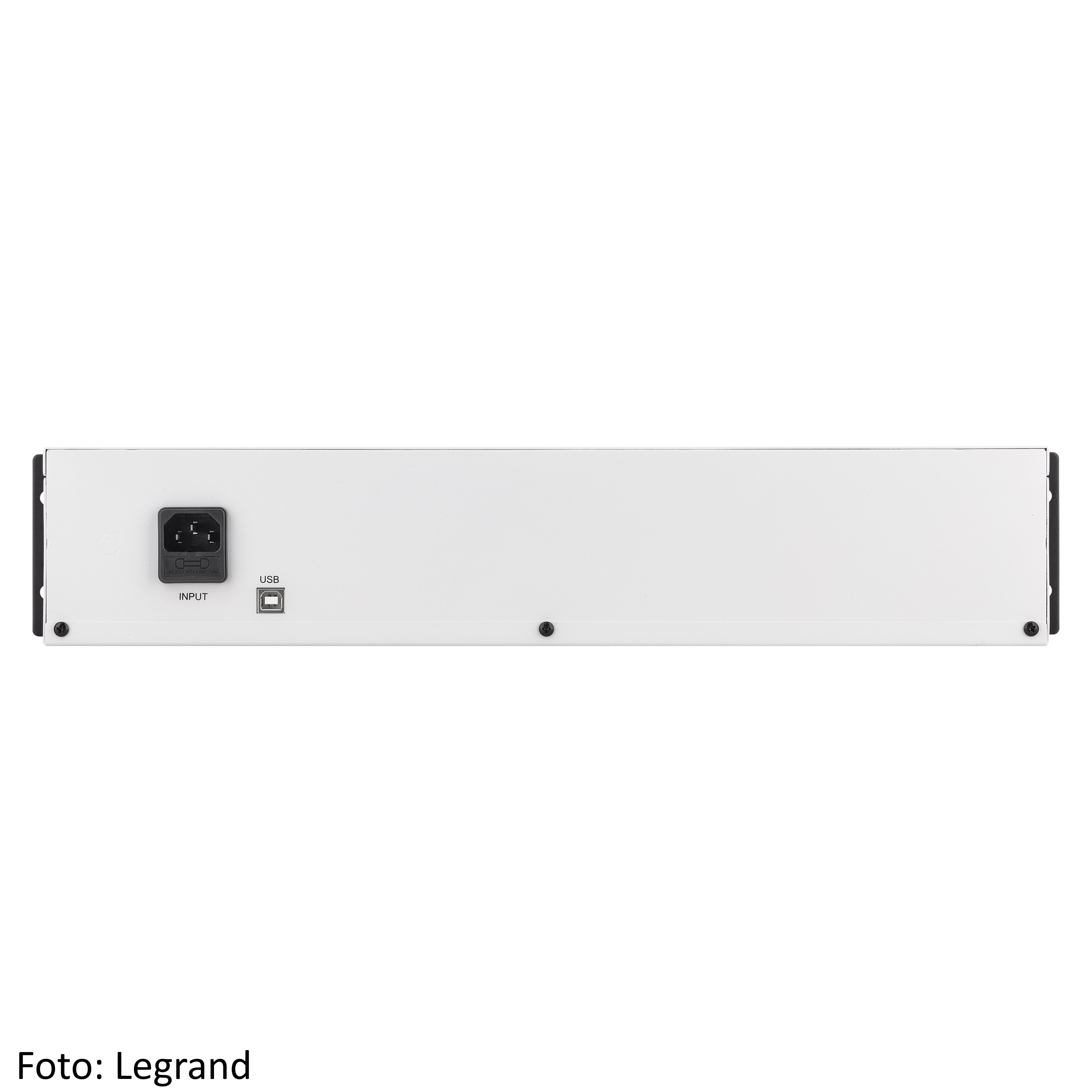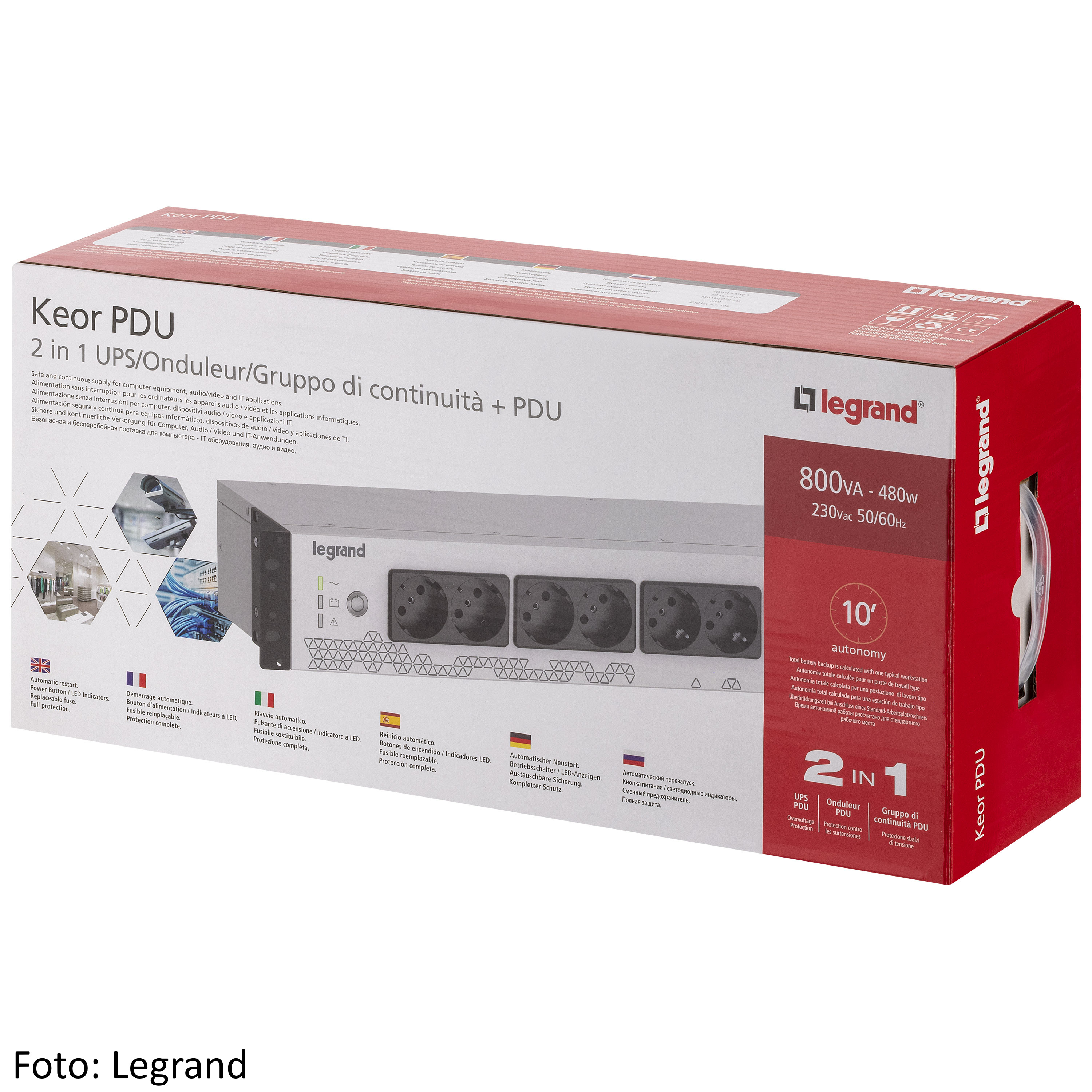 The KEOR PDU 800VA UPS model is an uninterruptible power supply with OFF-Line technology. The CPU-controlled unit provides an output power of 480 W and is equipped with maintenance-free, valve-regulated (VRLA) lead-acid batteries. This ensures a backup time of 10 minutes at 50% load and 3 minutes at 80% load. The Keor PDU effectively protects connected devices against any disturbances from the power grid.