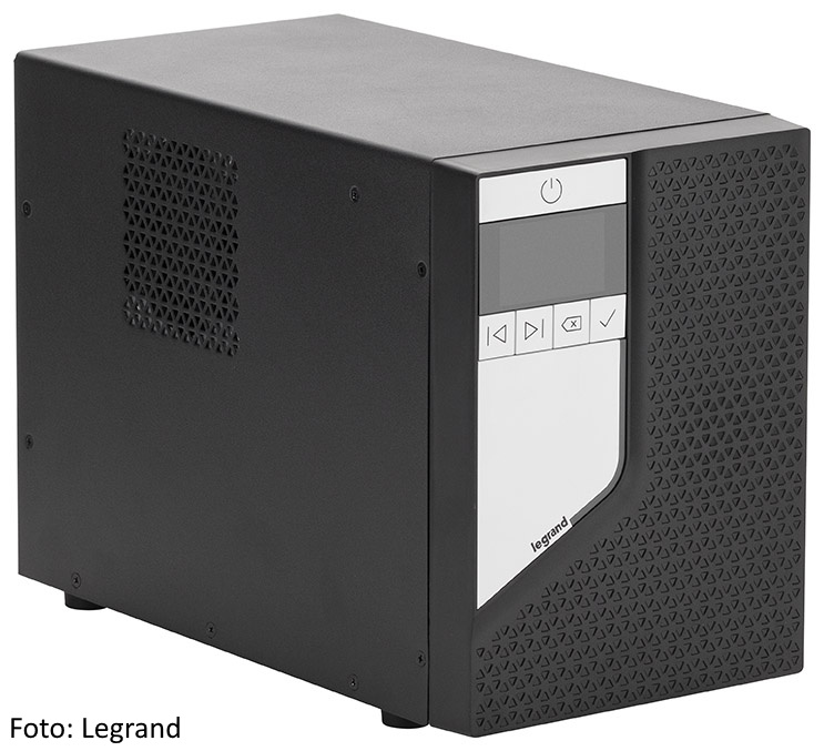 The Legrand UPS Keor SPE Tower 750 is an uninterruptible power supply with line-interactive technology and sine-wave output. It provides a rated power of 750 VA (600 W), is managed by a microprocessor, features integrated self-diagnostics, and supports cold-start operation.